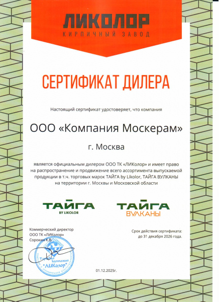 Сертификат официального дилера Ликолор 2026